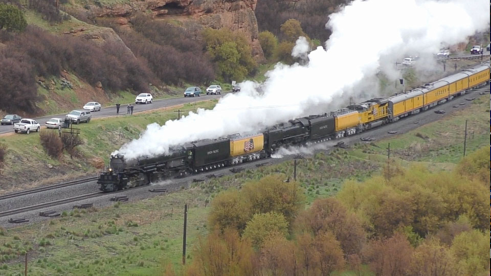 In May of 2019 UP Big Boy 4014 steamed again for the first time in 60 years. It ran from Cheyenne WY to Ogden UT with overnight stops in Rawlins, Rock Springs and Evanston. The double header train included UP 844 - another big steam locomotive. I was on Bus chasing the train all the way to Ogden. We had plenty of opportunity for video and still pictures. Here is a selection.